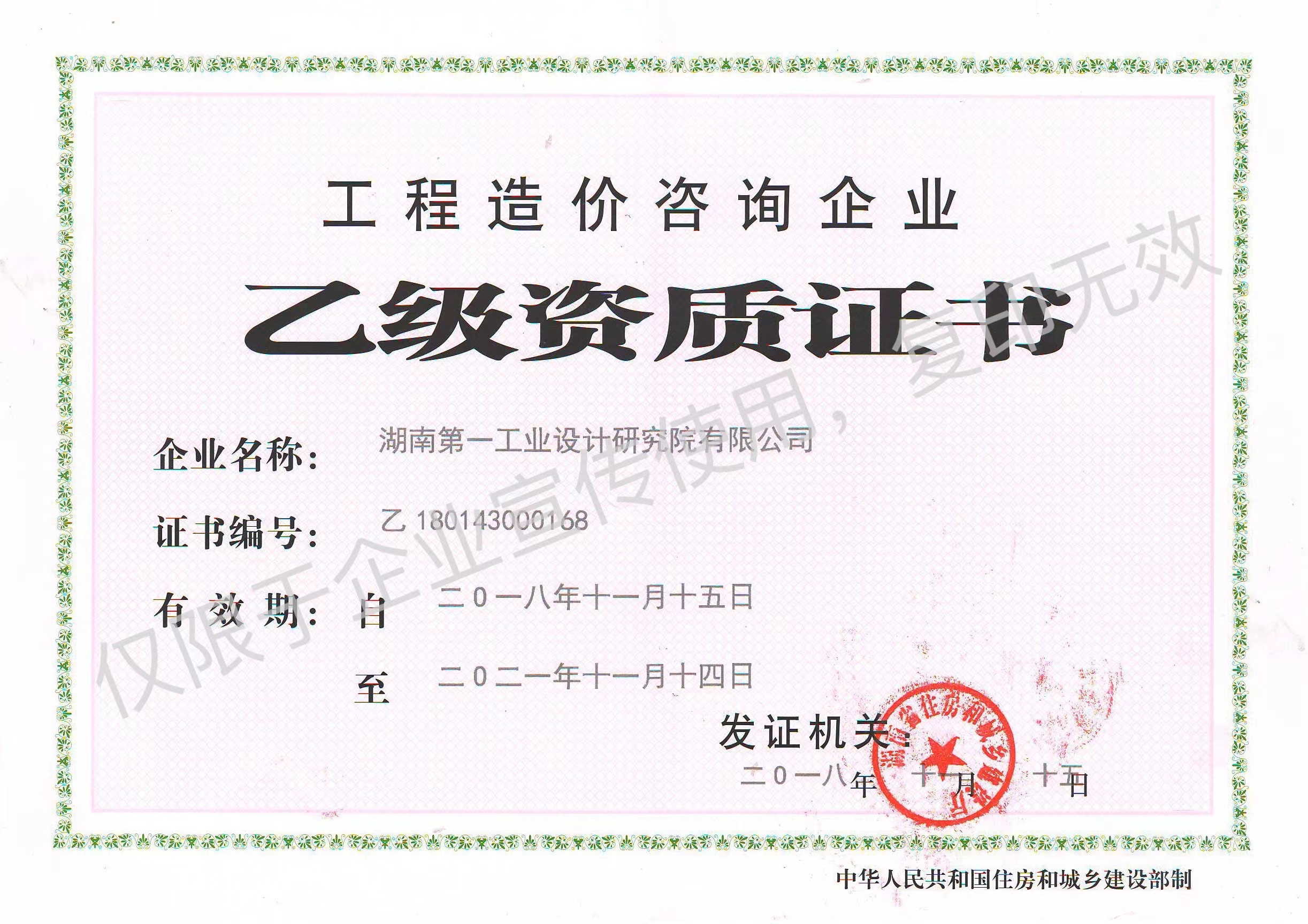 工程造價(jià)咨詢企業(yè)乙級資質(zhì)證書